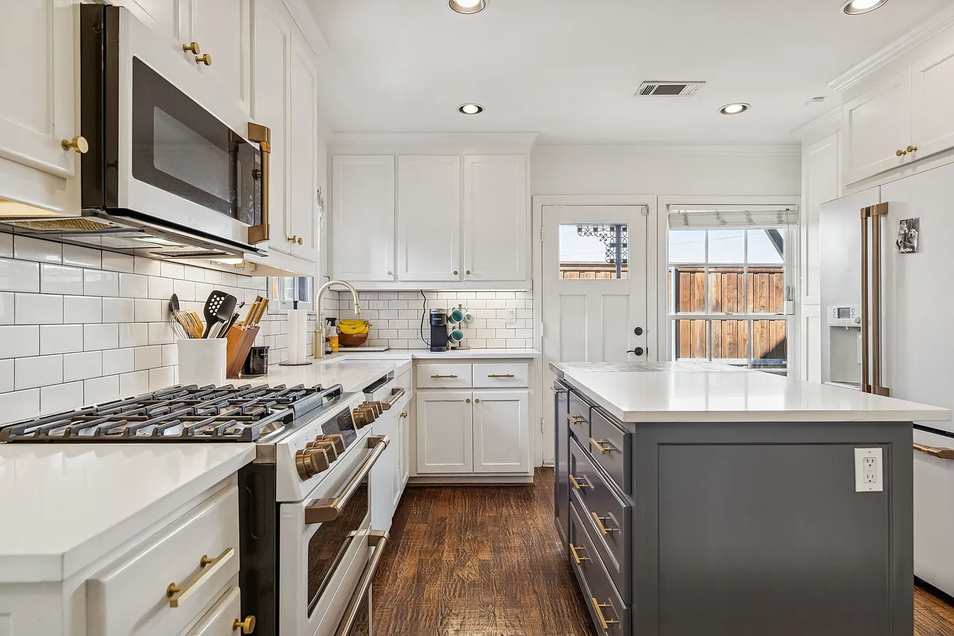 A beautifully designed home with vaulted ceilings, rich hardwood floors, and an open-concept living area centered around a cozy fireplace and French doors that invite natural light. The stylish kitchen features crisp white cabinetry, subway tile backsplash, and a spacious island with brass accents, perfect for everyday living and entertaining. Step outside to a private backyard oasis complete with a sparkling pool, lounge seating, and warm evening ambiance ideal for relaxing under the stars.